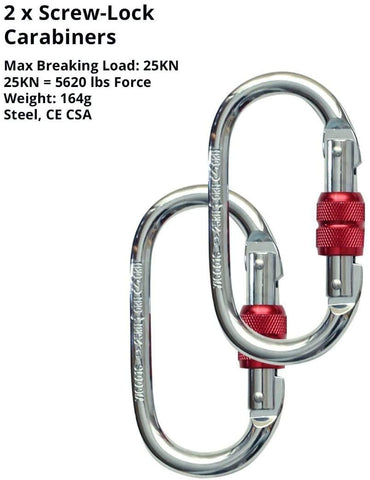 • Made from Certified Quality Materials And Hardware. 1 x 5.5 yards Elastic aerial hammock, 2 x Steel Screw-lock Carabiners (25KN), 2 x 3ft Nylon Reinforced Daisy Chains (23KN). Max rated for 2,000lbs dynamic load. The Daisy Chains and carabiners are certified to climbing standards.